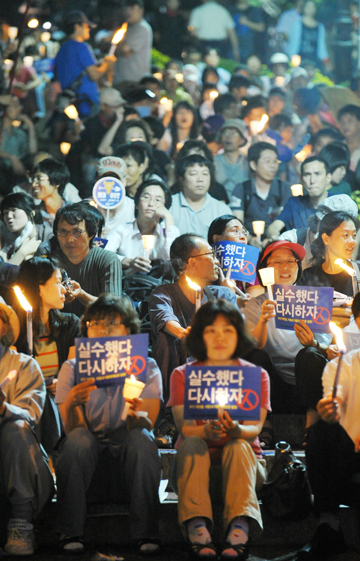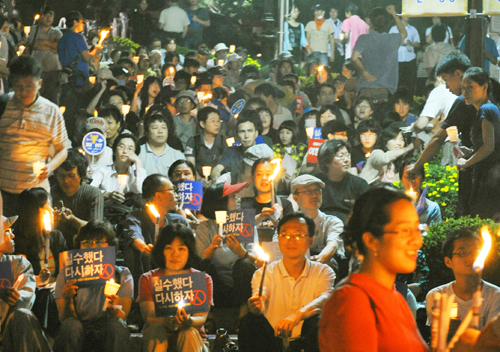 | ▲ 101차 촛불, 촛불은 계속된다 / 101차 미국산 쇠고기 수입 반대 촛불집회가 열린 16일 밤 서울 명동성당 앞에서 참가자들이 촛불을 들고 앉아 있다. ⓒ뉴시스 | ||