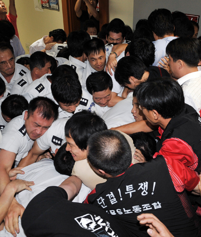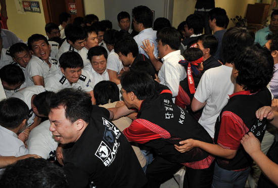 | ▲ 몸싸움하는 KBS 노사 / KBS 사장후보 서류심사를 위한 임시이사회가 열릴 예정인 21일 오전 여의도 KBS 본관에서 이사회장에 봉쇄하려는 노조원과 이를 막는 청원경찰들이 몸싸움을 하고 있다. ⓒ뉴시스 | ||