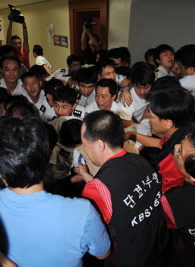 | ▲ KBS 임시이사회,막고 뚫어라 / KBS 사장후보 서류심사를 위한 임시이사회가 열릴 예정인 21일 오전 여의도 KBS 본관에서 이사회장에 봉쇄하려는 노조원과 이를 막는 청원경찰들이 몸싸움을 하고 있다. ⓒ뉴시스 | ||