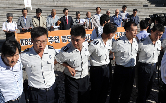 | ▲ KBS 이사회 해체 촉구 기자회견과 청원경찰 / 21일 오전 여의도 KBS 본관 앞에서 방송장악-네티즌탄압저지범국민운동 주최로 KBS 사장 추천 중단 및 이사회 해체 촉구 기자회견이 열린 가운데 청원경찰들이 주위를 둘러싸고 있다. ⓒ뉴시스 | ||