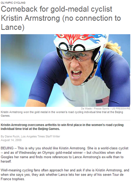 ▲ Los Angeles Times가 지난 14일 온라인 판에 올린 기사 'Comeback for gold-medal cyclist Kristin Armstrong (no connection to Lance)' |