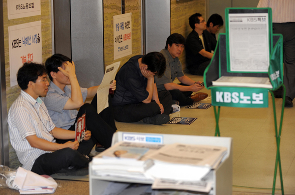 | ▲ 고개숙인 KBS 사원 / KBS 차기 사장 후보자 면접을 위한 임시이사회가 열린 25일 오전 서울 여의도 KBS방송국에서 사원들과 노조원들이 회의장으로 향하는 승강기와 복도를 점거하고 있다. ⓒ뉴시스 | ||