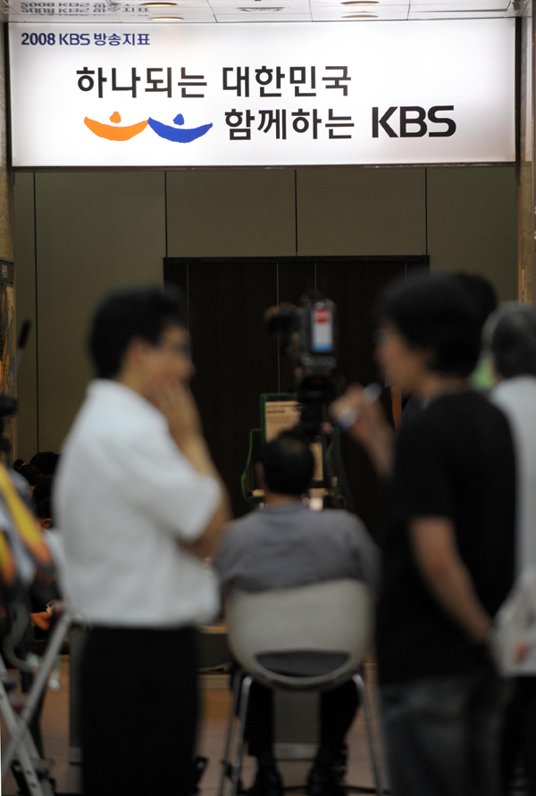 | ▲ 긴장감도는 KBS / 25일 오전 서울 여의도 KBS방송국에서 열린 KBS 차기 사장 후보자 면접을 위한 임시이사회가 비공개로 진행되자 수많은 취재진들이 로비에 대기해 있다. ⓒ뉴시스 | ||