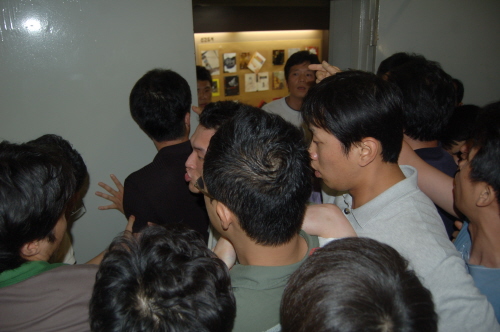 | ▲ 사장 임명 제청 뒤 유재천 이사장이 본관 지하 식당을 통해 밖으로 나가려 한다는 소식을 듣고 사원행동 측 직원들이 지하 식당으로 가는 문에 들어서려는 과정에서 청원경찰들과 몸싸움을 벌이고 있다. | ||