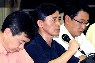 ▲ 이명박 대통령이 이병순 KBS비지니스 사장을 KBS사장으로 임명한 26일 오후 서울 여의도 KBS본관에서 '방송장악 청부사장 반대 KBS사원행동 기자회견'이 열린 가운데 양승동 PD협회장이 기자회견문을 낭독하고 있다. <사진=뉴시스> |