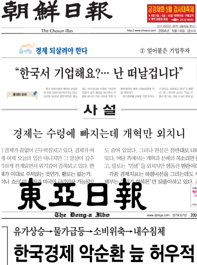 동아는 5월11일부터 ‘경제 이대로 주저앉나’, 14일부터 ‘내수불황 긴급 르포-경제 좀 살려주세요’라는 시리즈를 각각 3회씩 내보내며 다급하게 ‘위기’를 외쳤다. 중앙은 5월11일자 사설 ‘경제는 수렁에 빠지는데 개혁만 외치나?’에서 “경제가 망가지고, 경제가 무너지는 판에 언제까지나 개혁만 외칠 것인가”라고 주장했다.