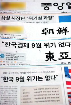 2008년 9월 ‘경제 위기설’에 대한 세 신문의 보도는 2004년과 달라도 너무 다르다. 이들 신문들은 9월 첫째 주, 경제 위기설 확산을 방어하는 기사를 여러 관점에서 폭넓게 제시했다. 정부의 늑장대응을 지적하는 기사도 있었지만 위기설을 대하는 세 신문의 공통 논조는 한마디로 ‘한국경제 위기 없다’였다. ‘지표 악화보다 위기설이 더 위험’(동아) ‘“한국경제 9월 위기없다”’(조선) ‘“위기론 자꾸 거론하면 금융시장 그렇게 간다”’(중앙) 등에서 보듯 위기설 확산 차단에 주력하고 있다.