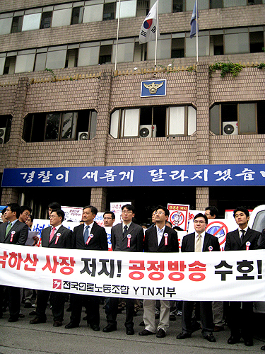 ▲ YTN 노조(위원장 노종면)는 25일 서울 남대문경찰서 앞에서 기자회견을 열고 "경찰 조사가 (정권이) YTN을 장악하려는 음모를 밝히는 계기가 될 것"이라고 밝혔다. |