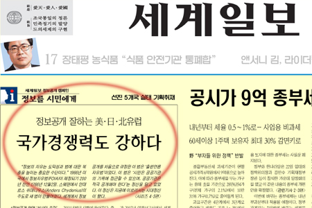 ▲ 23일자 세계일보 1면에 정보공개 캠페인-선진 5개국 실태 기획취재에 대한 머리기사가 실렸다.