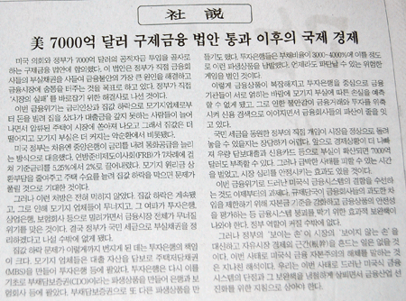 조선은 지난달 30일 ‘美 7000억 달러 구제금융 법안 통과 이후의 국제 경제’라는 사설(A35면)에서 “미국 의회와 정부가 7천억 달러의 공적자금 투입을 골자로 하는 구제금융 법안에 합의했다”고 전했다.