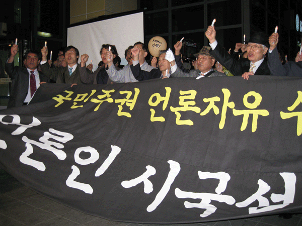 ▲ "바위처럼 살자꾸나." 촛불문화제에 참여한 언론인과 시민들이 노래패의 노래를 따라 부르고 있다. |