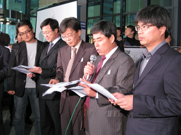 이들은 전국 7천8백여명의 언론인 서명이 적힌 대형 현수막으로 YTN 사옥을 감싸는 퍼포먼스를 선보이며 "언론인의 손으로 권력으로부터 언론 자유를 지키겠다"고 선언했다.