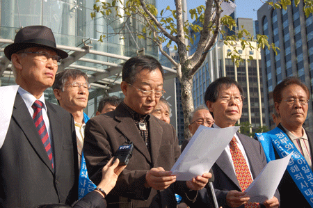 ▲ 29일 오후 서울 세종로 동아일보 사옥 앞에서 동아자유언론수호투쟁위원회 소속 전 동아기자 20이 “정부와 동아일보사는 1975년 기자 강제 해직사건에 대해 사과하라”고 요구하며 기자회견을 열고있다. |