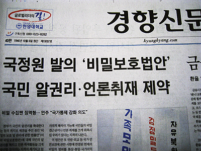 경향은 이날 1면 머리와 8면 기사를 통해 “비밀보호법안은 비밀의 탐지·수집 행위만으로도 징역형에 처할 수 있도록 한 데다, 필요할 경우 정부가 언론사 및 기자를 조사할 수 있는 길을 열어놓고 있다”면서 “각 기관의 편의적 비밀 지정에 대한 검증과 제재가 사실상 불가능하다는 점도 지적된다”고 밝혔다.
