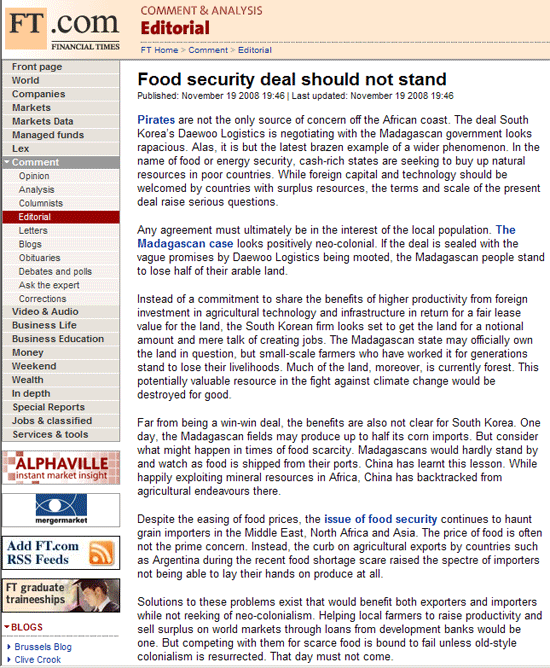 이 기사가 나가자 영국 파이낸셜타임스는 20일 1면 기사와 3면 사설에서 “대우로지스틱스가 공짜로 땅을 가져갔다(Daewoo to pay nothing for vast land acquisition)” “신식민주의(The madagascn case looks positively Neo-colonial)” “해적(Pirates are not the only source of concern off the African coast)” 등 원색적인 단어와 비유로 대우로지스틱스를 비난하고 나섰다.