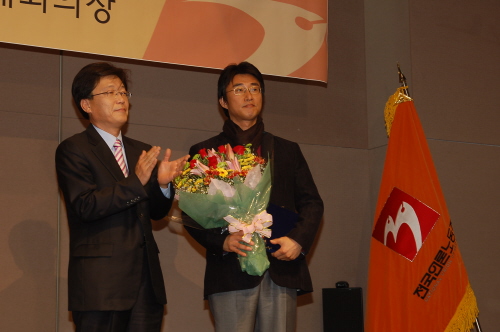 ▲ 언론노조 창립 20주년 기념식과 함께 열린 제18회 민주언론상 시상식에서 YTN노조 노종면 위원장(사진 오른쪽)이 상패를 받고 행사 참석자들에게 답례하고 있다. 사진 왼쪽은 최상재 언론노조 위원장. |
