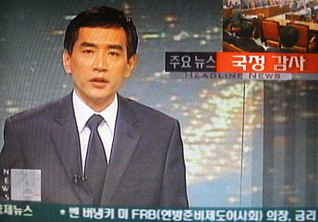 ▲ YTN 함형건 앵커가 조합원 징계에 대한 항의 표시로 검은색 정장을 입고 뉴스를 진행하고 있다. |