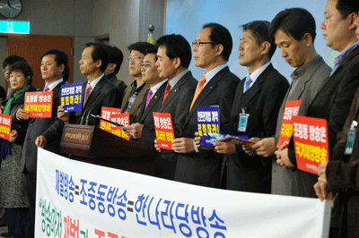 | ▲ 10일 오전 국회 정론관에서 민주당 전병헌, 최문순, 장세환 의원 민주노동당 권영길 의원 창조한국당, 진보신당 등 야당과 미디어 관련 시민사회단체 등이 방송을 통째로 뺏어 족벌신문과 거대재벌에 바치려 한다며 한나라당이 내놓은 7개 언론관련법 개악안 철회하라며 기자회견을 하고 있다. (사진=뉴시스) | ||