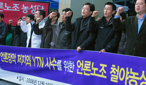 | ▲ 언론노조는 10일 오후 1시 서울 남대문로 YTN 사옥 앞에서 기자회견을 갖고 “한나라당 언론장악 악법 저지와 YTN 사수를 위한 천막 철야 농성에 돌입한다”고 밝혔다. 사진은 기자회견 직후 언론노조 소속 지부장들이 결의를 다지고 있는 모습. | ||