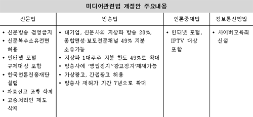 방송사에 ‘영업정지’ ‘광고정지’ 제재 가능 한나라당 미디어산업발전특별위원회가 확정한 미디어 관계법 개정안의 핵심은 신문법과 방송법 IPTV 법에서 신문과 대기업의 방송 소유 제한을 대폭 완화한 것이다.