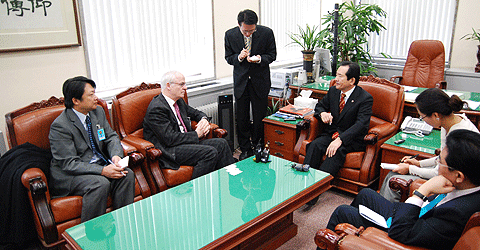 ▲ 16일 오전 국회를 방문한 에이단 화이트 IFJ 사무총장 등 예비실사단이 정세균 민주당 대표를 만나 간담회를 하고 있다. |