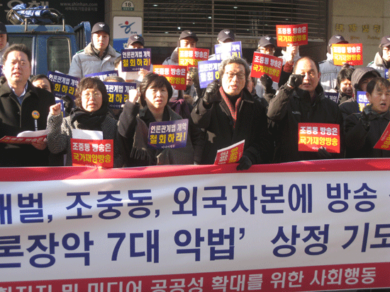 ▲ 미디어행동은 22일 서울 여의도 한나라당사 앞에서 '언론장악 7대 악법' 저지 기자회견을 열고 "한나라당은 7대 악법을 즉각 폐기하고 독재 장기집권의 꿈을 버려라"고 요구했다