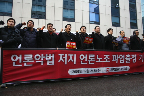 언론노조는 24일 서울 여의도 한나라당사 앞에서 파업 출정식을 열고 26일 오전 6시부터 신문과 방송 제작 기타 관련 업무를 중단하는 총파업에 들어가겠다고 밝혔다.