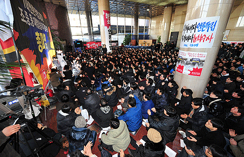 | ▲ 26일 오전 서울 여의도 문화방송 로비에서 7대 언론악법과 재벌방송 저지를 위한 전국언론노동조합 MBC본부 총파업 출정식이 열리고 있다. (사진=뉴시스) | ||
