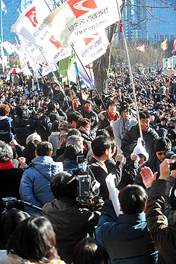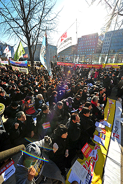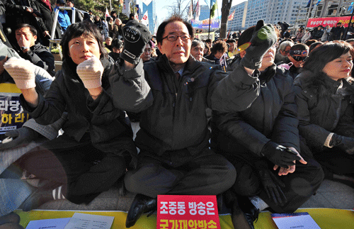 | ▲ 26일 오후 서울 여의도 국민은행 앞에서 언론장악 7대 악법저지 전국언론노조 총파업 출정대회가 열리고 있다. (사진=뉴시스) | ||
