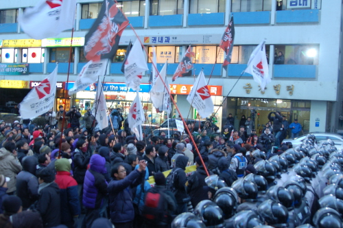 ▲ 출정대회를 마친 언론노조 조합원들이 여의도 한나라당사 앞으로 행진, 출동한 경찰들과 대치하고 있다. |
