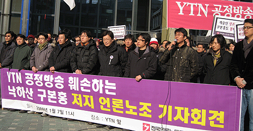 ▲ 전국언론노동조합(위원장 최상재)은 7일 서울 남대문로 YTN 사옥 앞에서 기자회견을 갖고 "구본홍 사장은 당장 사퇴하라"고 촉구했다. |