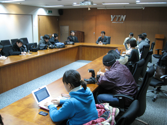 ▲ YTN 배석규 전무가 18일 오후 4시 부.팀장 60여명이 모인 가운데 긴급 확대간부회의를 주재하고 있다. 간부들은 이날 회의를 통해 노조의 사장실 점거와 출근 저지 투쟁 등에 단호히 대처하기로 의견을 모았다. |