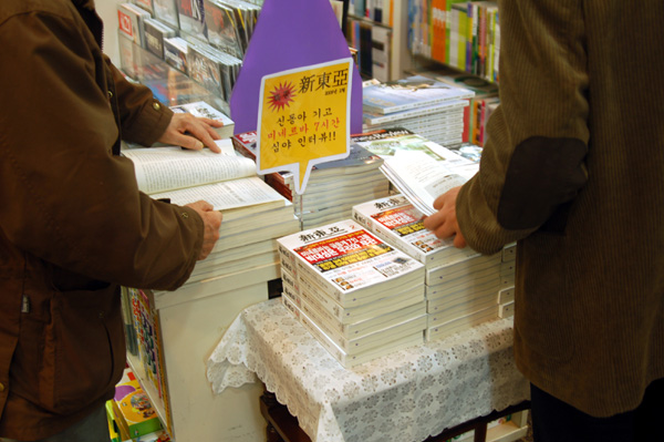 ▲ 서울 종로구 1가 교보문고 광화문점 월간지 코너에 전시된 신동아 2월호. ‘신동아 기고 미네르바 7시간 심야인터뷰’라는 안내 팻말이 눈에 띈다. |