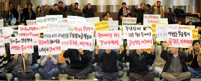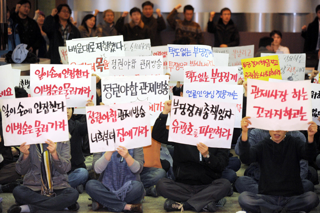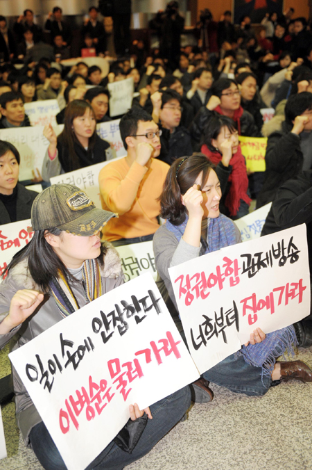 KBS 기자협회와 PD협회 회원들이 사원행동 지도부에 대한 중징계에 반발, 28일 오후 서울 여의도 KBS본관 민주광장에서 무기한 제작거부 출정식을 갖고 '사측은 잘못된 징계를 조건 없이 철회한뒤 징계 책임자를 엄중 문책하라'고 요구하고 있다