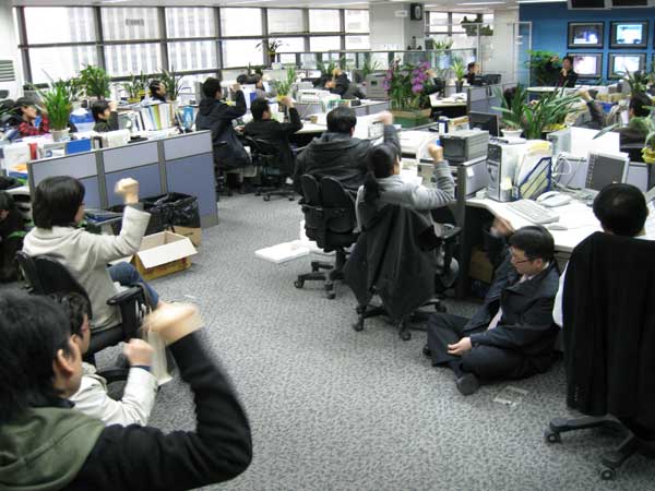 | ▲ YTN 노조 조합원들이 2일 서울 남대문로 YTN 사옥 19층 보도국에서 비상총회를 갖고 “정치권의 허수아비 부팀장은 각성하라”등의 구호를 외치고 있다. | ||