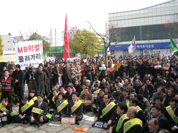 미디어행동은 7일 오후 2시30분 김해시 봉황동 수로왕릉공원 앞에서 3백여명이 모인 가운데 민주당 등의 주최로 열린 ‘용산 폭력 살인 진압 규탄 및 미디어 악법 저지를 위한 결의대회’에 참석, 미디어 관련법의 부당성을 알렸다.