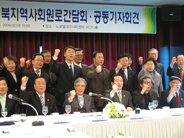 ▲ 대구경북 사회원로 20여명이 8일 대구시 중구 문화동 노보텔대구시티센터 8층 버건디홀에서 공동기자회견을 갖고 경찰의 용산 불법 진압과 한나라당의 MB악법을 강력 규탄했다. |