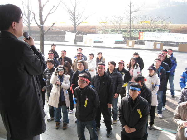 | ▲ 경남일보 노조(위원장 강진성) 소속 조합원 40여명이 8일 파업 5일째를 맞아 격려 방문한 최상재 언론노조 위원장의 발언을 듣고 있다. 경남일보 노조는 10일 사측과 타협안을 도출, 파업을 철회했다. | ||