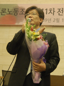 | ▲ 언론노조 최상재 신임 위원장이 12일 서울 남대문 대한상공회의소 대회의실에서 열린 정기 대의원대회에서 제5대 위원장으로 선출된 뒤 소감을 밝히고 있다. | ||