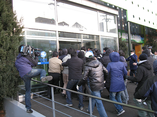 | ▲ OBS 희망조합 소속 조합원들이 ‘쪽문’ 출근을 감행한 차용규 사장을 막으러 뛰어가고 있다. | ||