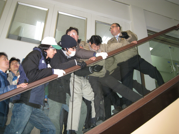 이에 회사 측은 취임식장 안에 있던 현수막을 떼어 내 2층 회의실로 옮겨 갔으며 회의실 전 출입구를 봉쇄했다. 노조원과 회사 측이 고용한 사설 경비업체 직원들이 계단에서 격렬한 몸싸움을 벌였으나 노조는 끝내 진입하지 못했다.