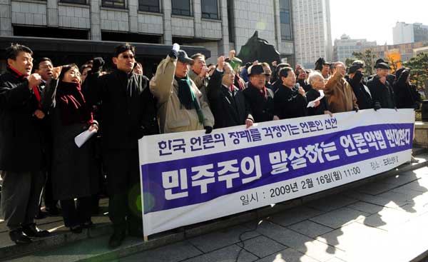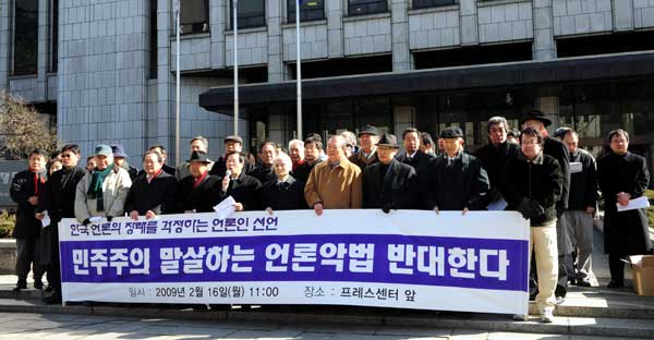 16일 오후 서울 프레스센터 앞에서 언론의 장래를 걱정하는 원로 언론인들이 '민주주의 말살하는 언론악법 반대한다'라는 주제로 시국선언을 갖고 있다.