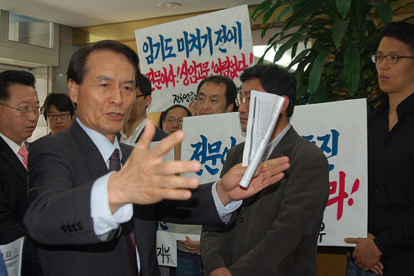 | CBS 노조원들이 이사회 회의장 문을 막고 피켓팅을 벌이자 EBS 출신 이덕선 이사(예장통합)가 항의하고 있다. | ||
