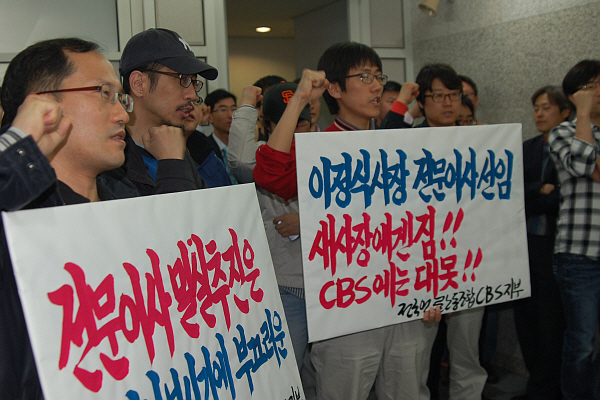 | CBS 노조원들이 이정식 사장의 전문이사 선임을 반대하는 구호를 외치고 있다. | ||
