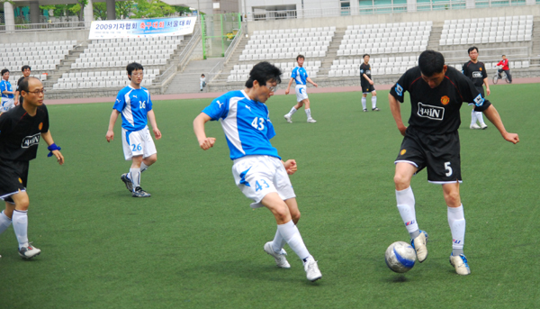 | ▲ 10일 열린 경향신문과 한국일보의 16강전에서 한국일보 선수가 경향신문 진영으로 공을 몰고 들어가고 있다. 경기 결과는 한국의 승리. | ||
