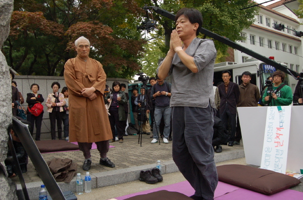 | ▲ 최상재 위원장이 1만배 중 탈진해 한 자원봉사자가 마시지를 해주고 있다. | ||