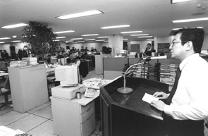 사진설명:96년 안기부는 한겨레 광고 수주를 방해한 것으로 밝혀졌으며 한겨레는 자금 마련, 대통령 면담 등의 대책을 세웠다. 사진은 96년 12월 사원총회 장면. 사진제공=미디어오늘