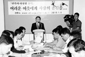 사진설명:김완주 전주시장이 지난해 9월 시청 기자실에서 추석을 맞아 벌이는 이웃돕기 행사에 시민들의 동참을 호소하는 기자회견을 하고 있다.