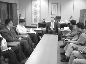 사진은 시위가 열리는 동안 노조 집행부와 공동대책위 대표들이 강대인 방송위 부위원장을 면담하고 적극적인 중재이행을 촉구하는 모습.
