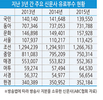 지난달 27일 ABC협회가 발표한 정기공사 자료에 따르면 조선의 발행부수는 2014년 167만여부에서 지난해 154만여부로 7.6%, 중앙도 같은 기간 105만여부에서 96만여부로 9.1%가량 줄었다.